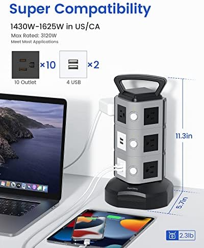 Amazon Com Surge Protector Power Strip Tower Superdanny 3000w 13a Desktop Charging Station 10 Outlet 4 2a 4 Usb Ports 16 Awg 6 5ft Extension Cord 3 Prong Grounded Multiple Protections For Home Office Everything Else